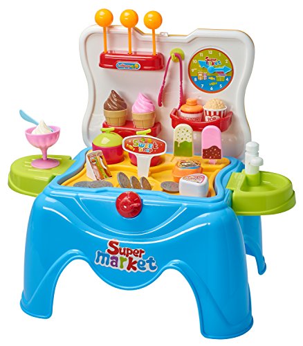 -. Feature : This 39 PC multi-functional Ice cream set includes toy food and utensils such as 2 ice cream cones, 2 ice pops, 6 coins, sundae, popcorn, Tongs, and tons more! / Ice cream accessories store neatly in the sturdy plastic container. Can convert into small stool and comes with a plastic handle for convenient carrying. / Your child will love playing the ice cream store role, as friends and family wait to buy some with the included pretend coins. / Develops children's imagination, hand-eye coordination and social skills. / All Dragon Too products comply with all USA toy safety standards and are 100% safe for children.