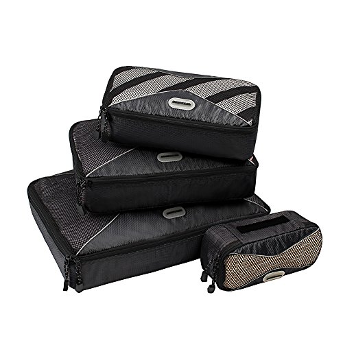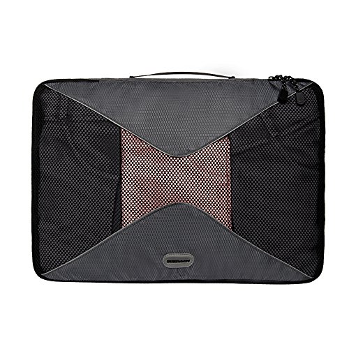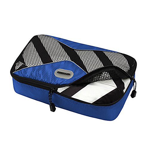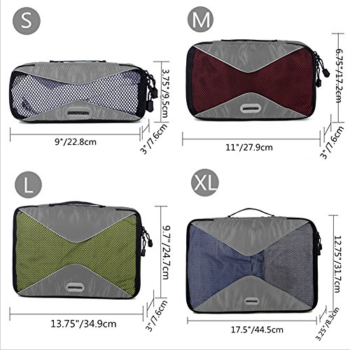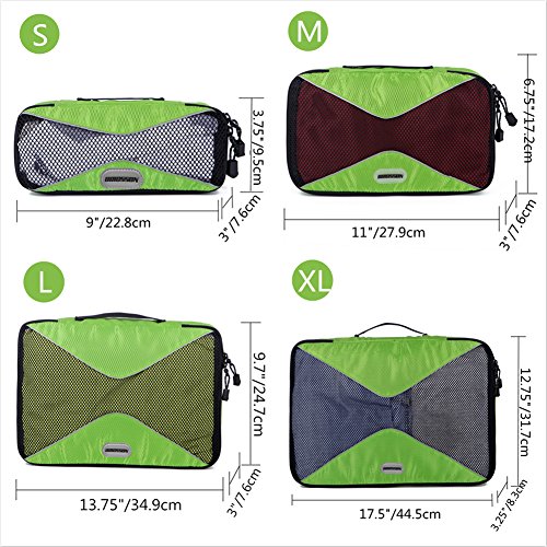 Come in 4 sizes: Extra Large (17.5 x 12.75 x 3.25 inches): for trousers, sweaters, towels and light jackets Large (13.75 x 9.75x 3 inches): for shirts, shorts, blouses and documents Meduim (11 x 6.75 x3 inches): for socks and underwear Small (9 x 3.75 x 3 inches): for cables, adapters and toiletries.