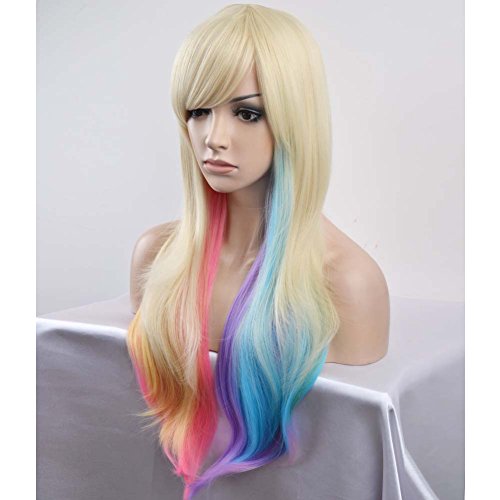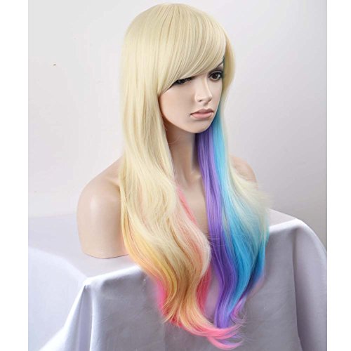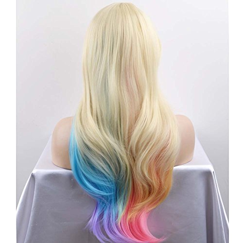 RightOn 28'' Long Wavy Blonde Pastel Rainbow Color Ombre Wig Durable Heat Resistant Synthetic Wig for Daily Use or Cosplay Hairnet Included (Multicolor)