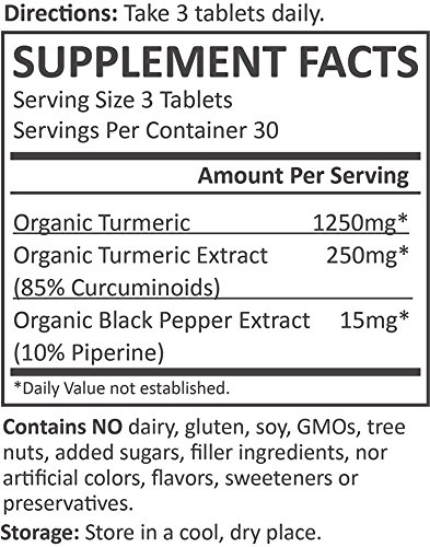 -. Feature : MADE WITH ONLY TWO INGREDIENTS | 1500mg of Organic Turmeric Curcumin and Organic Black Pepper (piperine) shown to increase the bioavailability of curcumin by 2000%. / 30 DAY SUPPLY | 90 ORGANIC TABLETS - Take 3 tablets daily. Not chewable (unless you really, really like the taste of raw turmeric) / SUPERFOOD Turmeric Curcumin supports the body's proper response to everyday joint stress* and supports the health of the cardiovascular system.* / POTENT SOURCE OF ANTIOXIDANTS Curcumin can also neutralize free radicals!* / 100% USDA ORGANIC vegan, dairy-free, soy-free, gluten-free, non-GMO, no artificial ingredients.