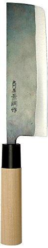Sword making history in Japan dates back over 1,000 years, when master swordsmiths practiced their craft making weapons for warriors. Modern Japanese kitchen knives are a descendant of these renowned swords, as evidenced in the details, ideals, and spirit that have been passed down through generations that go into each tool. This particular knife has a nakiri shape. Nakiri shaped knives are rectangular and have a squared end, and thus a flatter cutting edge than a tradtional western chef's knife. Therefore, this knife excels at tasks that require a single downward cut rather than a rocking motion, making it an excellent choice for prep work such as slicing and dicing. The use of carbon steel ensures that the knife holds a very sharp edge, while the outer sandwich of stainless steel prevents rust and damage. The black oxide finish of this knife further helps to prevent damage, while giving it a rustic appearance.