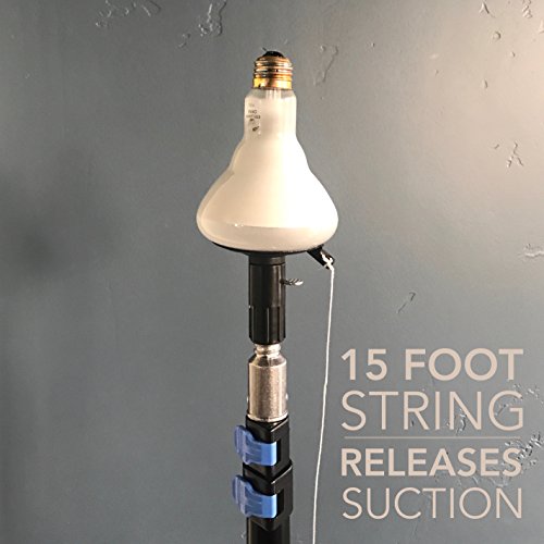 - LONGEST REACH OF ANY BULB CHANGER – Reach bulbs up to 20+ feet when standing. Simply adjust the lightweight, 3-Stage Extension pole to any length from 5-to-13 Feet. Once screwed back in, the 15-Foot String releases suction from the bulb.