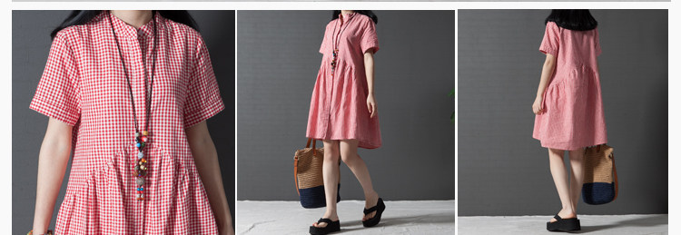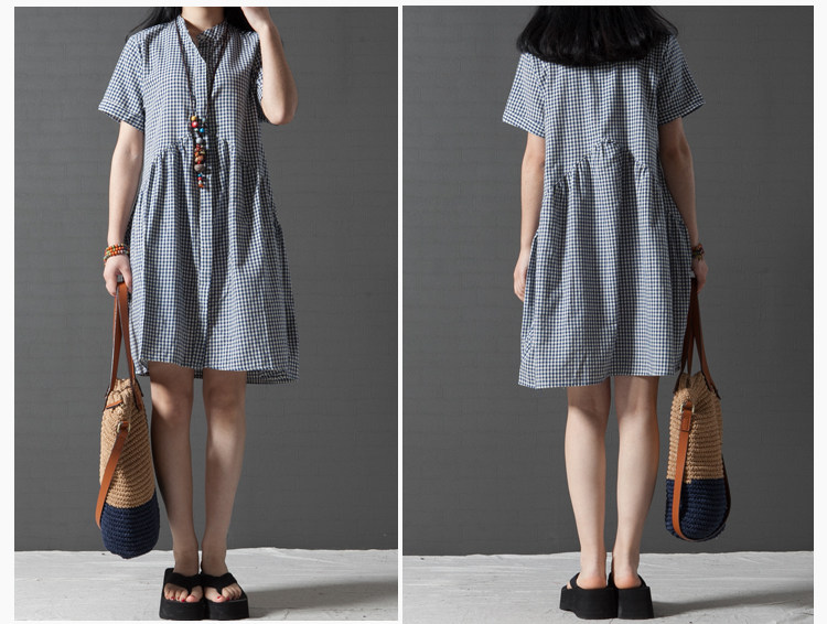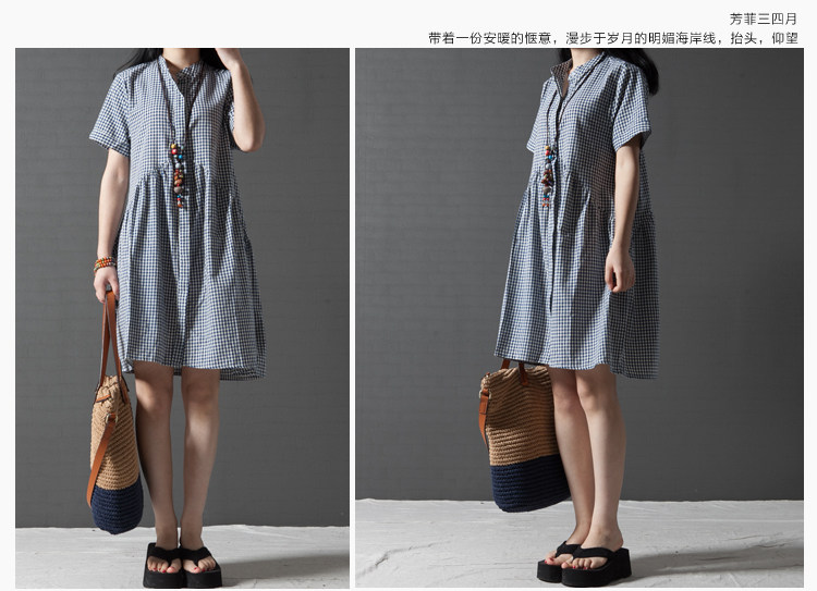 孕妇装夏装棉麻大码孕妇连衣裙韩版立领格子衬衣显瘦中长款孕妇裙