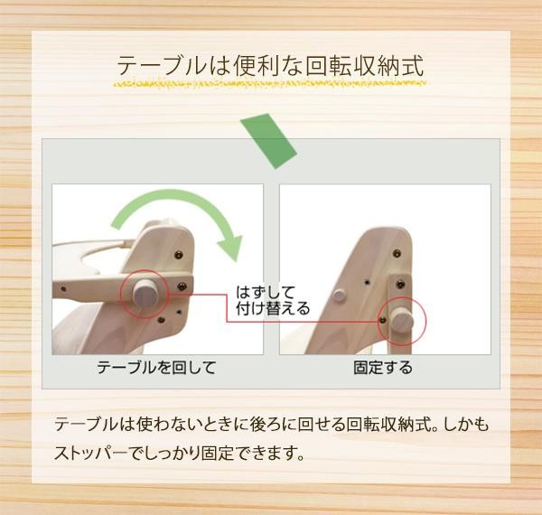 座板の高さ調節ができるチャイルドチェアです。ローテーブルでのお食事のほか、お絵かきしたり絵本を見たりおやつタイムなど日常に大活躍。ベルト付きですのでお子様がずり落ちることもありません。テーブルは使わないときは後ろに回転でき、木製つまみで固定できます。 |