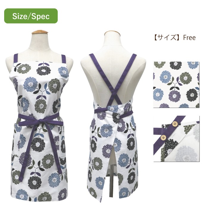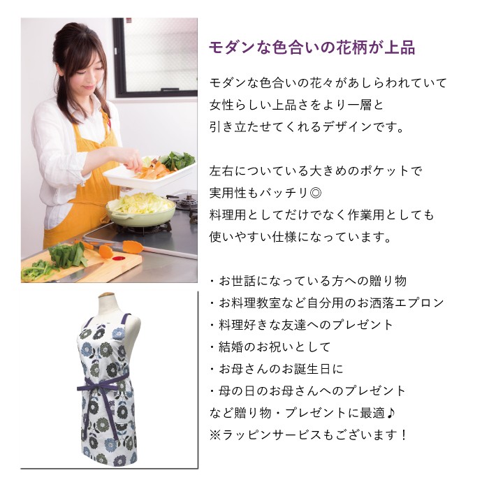モダンな色合いの花々をあしらってより一層上品さを惹き立たせてくれる おしゃれで可愛いエプロンです。 ■サイズ フリー 着丈(胸元のレースから裾まで) : 約71cm  ウエスト : 約84cm 腰紐(片側): 約90cm ■材 質 綿100%