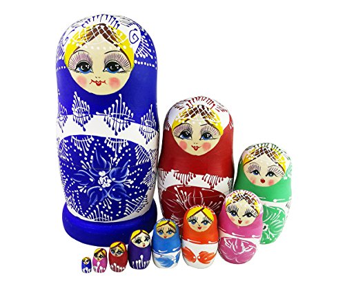 -. Feature : Traditional russian nesting dolls/russian dolls/matryoshka dolls / Contains 10 dolls,stacked into one another to appear as one / Blonde little girl with pink eye shadow and flowers pattern in kinds of bright colors / Children's great toy and wonderful decoration for house / Ideal gift in birthday,christmas or any special day