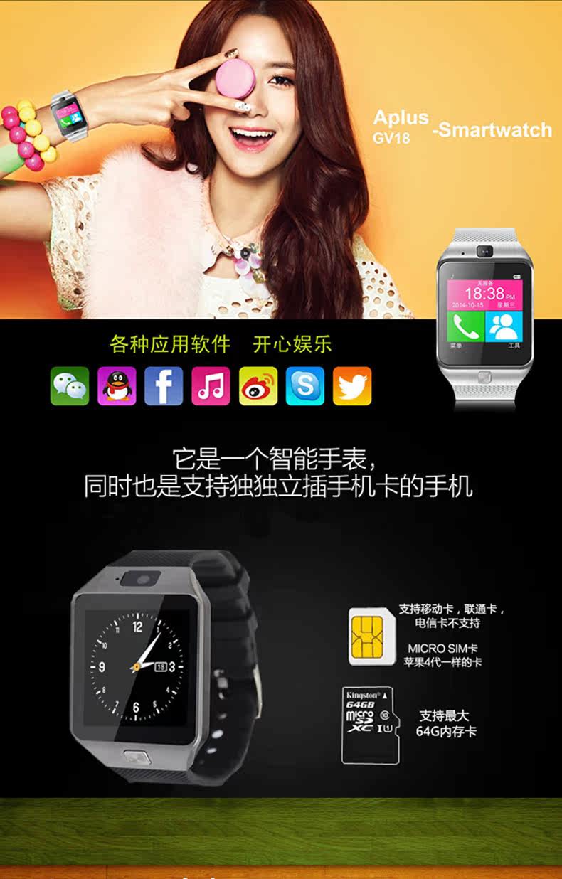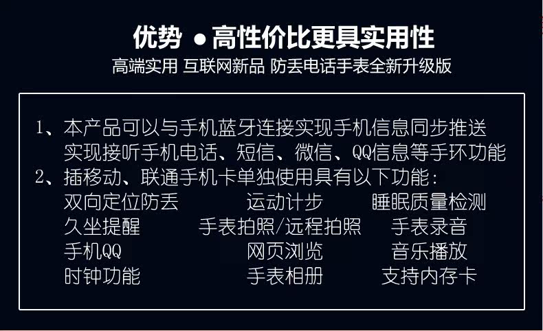 店长推荐:本防丢定位手表是升级版的,支持32G内存卡,同时支持蓝牙和移动或联通手机卡,QQ、微信、浏览新闻、拍照等功能,性价比极高。