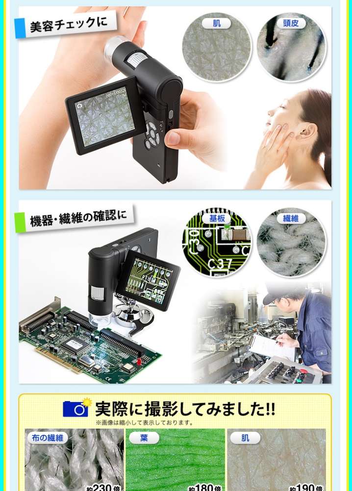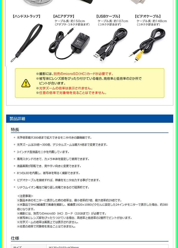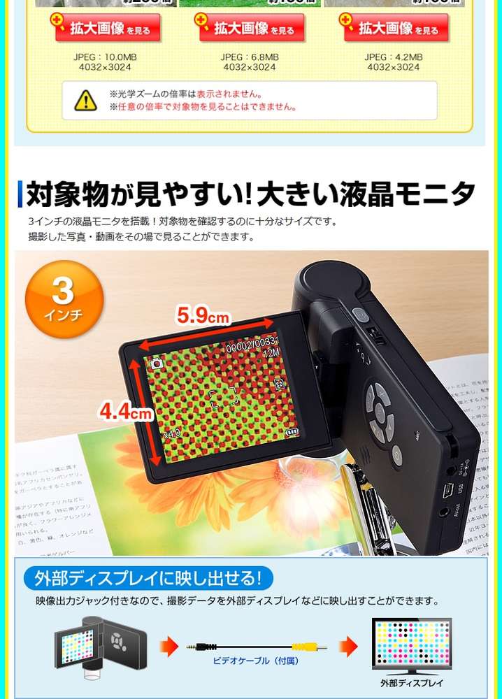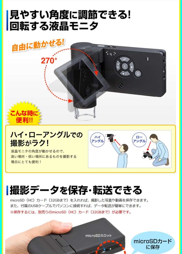 ●※製品本体のモニターに表示した時の倍率は、最小倍率約7倍、最大倍率約29倍です。※本製品で5Mの解像度で画像を撮影し、解像度1920×1080ピクセルに設定した24インチモニターで表示した場合、約380倍になります。※撮影には、別売りのmicroSD(HC)カード(32GBまで)が必要です。※被写体にレンズ部をぴったりつけている場合、高倍率と低倍率の2箇所でピントが合います。※光学ズームの倍率は画面上では表示されません。※任意の倍率で対象物を見ることはできません。