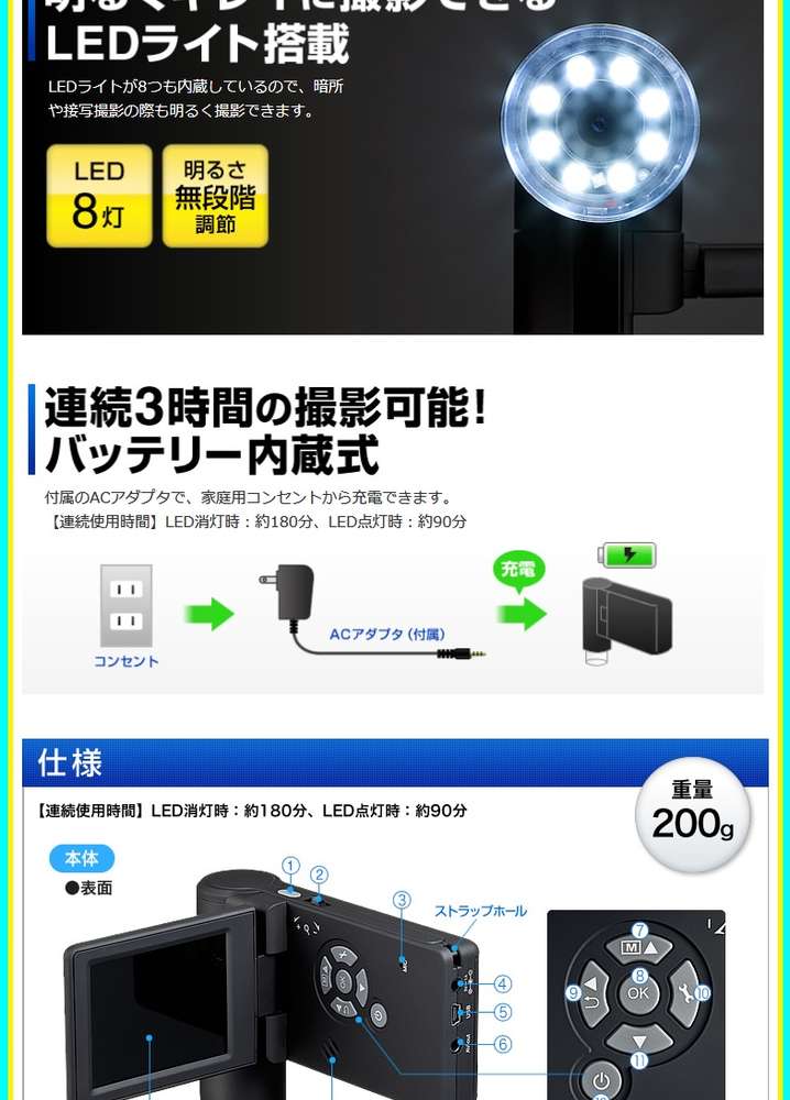 ●バッテリー寿命:最大90分(LED点灯時)