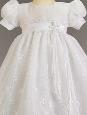 Adorable embroidered tulle gown with tie back sash and matching bonnet. Button back closure for easy changing. Perfect for christening, baptism, dedication, blessing, and weddings. Made in the USA.