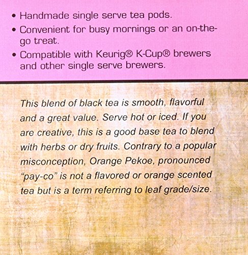 -. Binding : Grocery -. Brand : Special Tea -. EAN : 0687847813477 -. Feature : Handmade single serve tea pods / Convenient for busy mornings or an on-the-go treat / Compatible with Keurig K-cup brewers and other single serve brewers, not compatible with Keurig vue or rivo / Our single serve pods are individually sealed for freshness you will taste the difference / Brew two cups from a single cup -. Label : Special Tea -. Manufacturer : Special Tea -. MPN : 687847813477 -. NumberOfItems : 1 -. PackageQuantity : 1 -. PartNumber : 687847813477 -. ProductGroup : Grocery -. ProductTypeName : GROCERY -. PublicationDate : 2015-01-31 -. Publisher : Special Tea -. ReleaseDate : 2015-01-31 -. Studio : Special Tea -. Title : Special Tea Single Serve Cup China Orange Pekoe Black Tea, 10 Count -. UPC : 687847813477