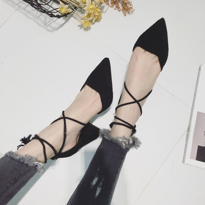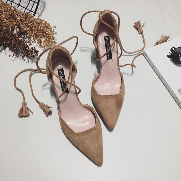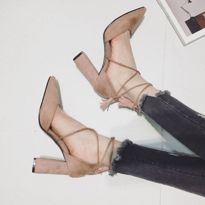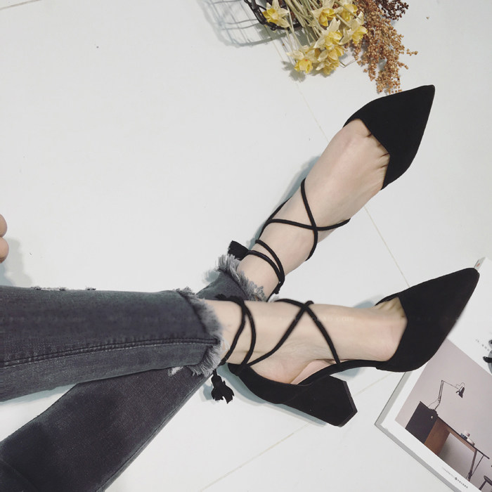 春秋夏季新款交叉绑带粗跟尖头单鞋子女流苏高跟鞋伴娘鞋中空凉鞋