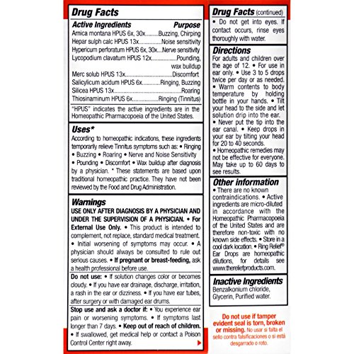 Studio : TRP Company Publisher : TRP Company Binding : Health and Beauty Product Description Ring Relief is a homeopathic product developed to provide multi-symptom therapy for the temporary relief of symptoms such as ringing, buzzing, or roaring in the ears. They also provide temporary relief for sensitivity to noise, nerve sensitivity in the ear, ear discomfort as well as ear congestion and throbbing. Ring Relief is safe and gentle to use with no known contraindications. Ringing in the ears can be treated with our two powerful homeopathic treatments: Ring Relief Drops and Ring ReliefFast Dissolving Tablets. 0