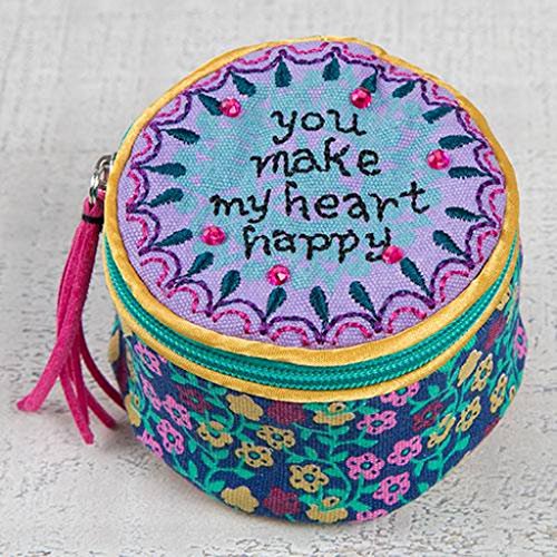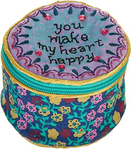 Studio : Natural Life Publisher : Natural Life Binding : Apparel Product Description Embroidery embellished details add a sweet charm to this Natural Life jewelry round offering a tassel zipper pull, a linen fabrication anda message that states You Make My Heart Happy. Perfect for jewelry storage while traveling. Measures 3 in. x 2 in. Cotton. Man-Made Material. 0