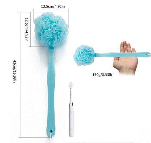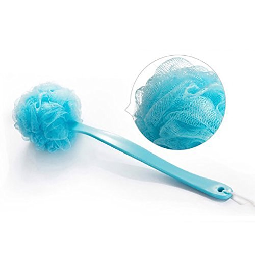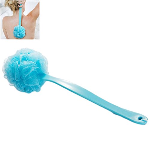 Product description When taking bath, It's always difficult to touch for some skins in the back,An 18-inch long bath brush to help you solve, Handle is ergonomically designed. PE environmental material, gently not hurt the skin, soft and flexible, rich foam to bring fresh bath. Package Including 1* Long handle shower brush with Sponge Loofahs nylon mesh bath brush ball (color: blue)