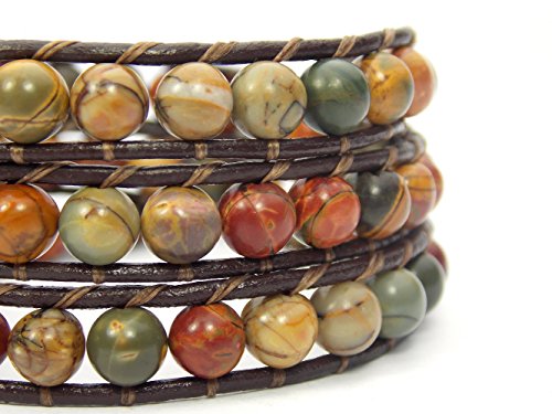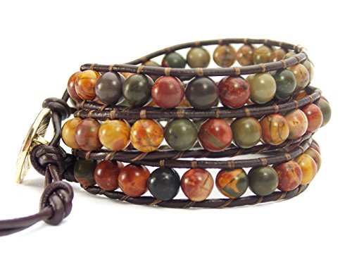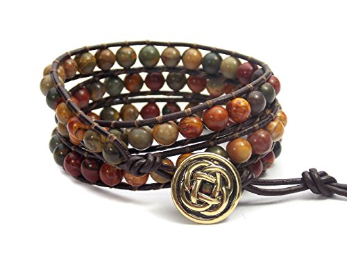 This Irish Celtic knot circle wrap bracelet is handcrafted with beautiful stabilized red creek picasso jasper beads sewn onto chocolate strands of leather. And features antiqued celtic button