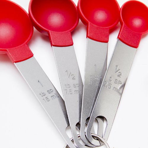 - Feature : Sturdy Stainless Steel Handles / Durable Plastic Cups & Spoons / Easy-to-Read Volumes / Handwashing Recommended. Dishwasher Safe - TOP RACK ONLY / Rings to Keep the Sets Together / **Set Includes 8 Pieces**