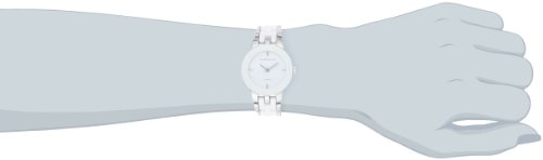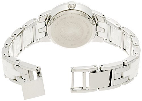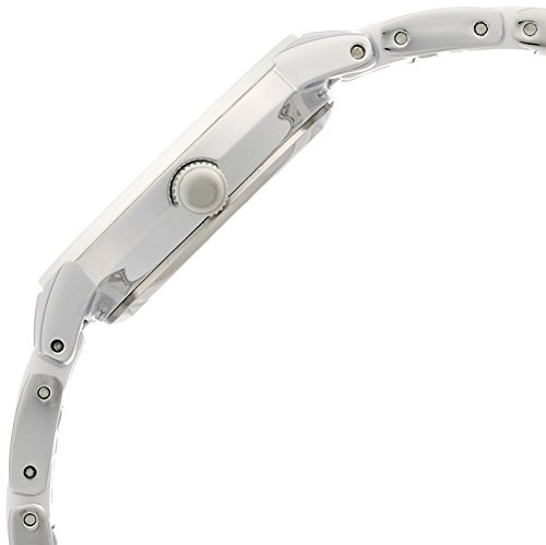 - Feature : Silver-tone watch featuring white dial with diamond at 12 o'clock and bracelet with white ceramic center links / Japanese quartz movement with analog display / Mineral crystal dial window / Features jewelry clasp closure / stick markers at three, six, and nine o'clock, and fluted crown / Water resistant to 99 feet (30 M): withstands rain and splashes of water, but not showering or submersion / 30mm round silver-tone case; wall-to-wall crystal with thick white dial frame / White dial with silver-tone markers at 3, 6, and 9; genuine diamond at 12 o'clock / Silver-tone hour, minute, and second hands / Silver-tone adjustable bracelet with white ceramic center links; jewelry clasp and extender / Water resistant to 99 feet (30 M): withstands rain and splashes of water, but not showering or submersion