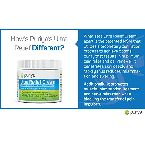 How is Puriya Ultra Relief Cream Different? Unlike most OTC (over the counter) products and prescription drugs, Ultra Relief Cream is formulated with the root cause in mind. More than masking the pain, it rapidly reduces inflammation and aids in cell rejuvenation which in turn speeds up recovery.? Why Choose Puriya Ultra Relief Cream? Puriya's Ultra Relief Cream is specifically formulated with pure natural ingredients to achieve maximum results in pain relief and cell rejuvenation. The patented proprietary MSM distillation process ensures its optimal purity thus helping penetrate skin deeply and rapidly thus reduces inflammation and swelling. This highly purified MSM greatly improves the absorption of other powerful healing ingredients (e.g. menthol, essential oils, vitamins, plant extract and patented organic plant acids) which in turn speeds up the recovery process. What Puriya Ultra Relief Cream is Not? This product contains no Paraben, preservatives or artificial fragrances. Puriya Ultra Relief Cream is 100% natural. 180 Day Money Back Guarantee: If you do not feel this product has reduced your pain and improved your range of motion, please contact us immediately for a full purchase refund. No questions asked!