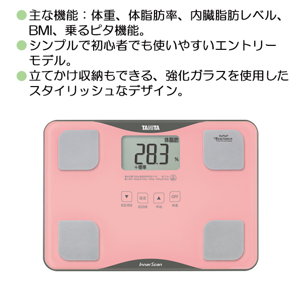 ●主な機能:体重、体脂肪率、内臓脂肪レベル、BMI、乗るピタ機能。