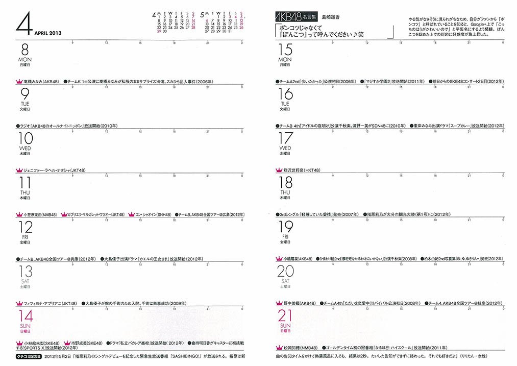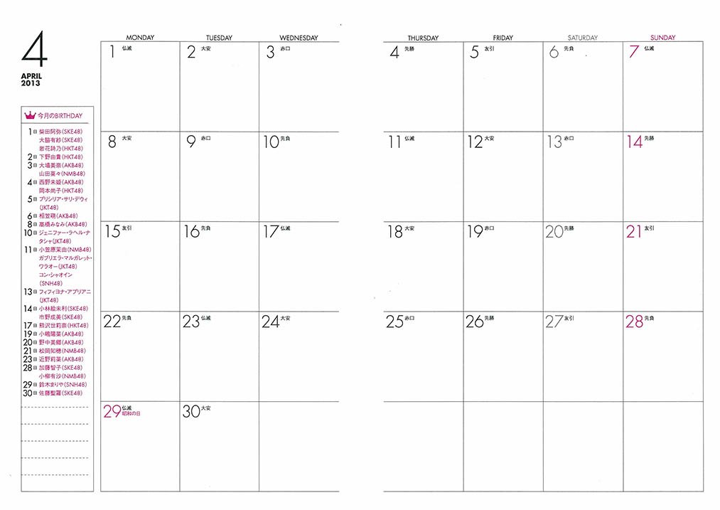 The official diary continued to be released last year, but last year it was a member of HKT 48 who has an initial expression compared with the profile photo currently used before Team H formation, and the first overseas sister group · I think that the list of all members including all the members including the original members of JKT 48 was also posted and it was fulfilling as a document, but I was still working in Shanghai in earnest without a work visa being issued Not including Miyazawa Sawa and Mariya Suzuki, this year also new members of SNH 48 are introduced. I think that it is easy to use as a diary, but this official diary is the only thing that I can see the member profile that is bigger and easier to see at the same time than last year, and other ranking of request hours and review anniversary, AKB 48 quotations Because I also post collections etc. I think that it is okay to get it as a document. In the performance, the 6th grader of SKE 48 who was just announced has not been posted yet, and only Kitahara Riyu only has a profile photo taken with AKB 48 (team K) and SKE 48 (team S) Although I think there are things that I am afraid, even though I think that it is worthwhile as the data of the AKB 48 group in 2013.