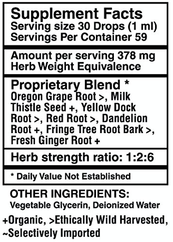 PROPRIETARY BLEND to cleanse and rid your liver & blood of toxins-Oregon Grape Root, Milk Thistle Seed, Yellow Dock Root, Red Root, Fresh Dandelion Root, Fringe Tree Bark and Fresh Ginger Root. Alcohol free, Gluten free herbal blend.