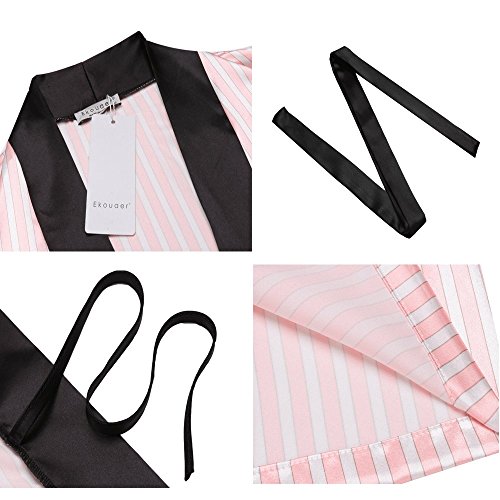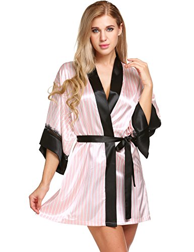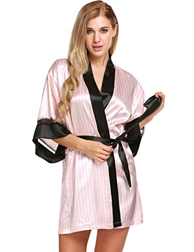 Ekouaer Women's Lace Trim Short Kimono Robe Seafolly Stripe Printed Sleepwear Nightgown Pink Large