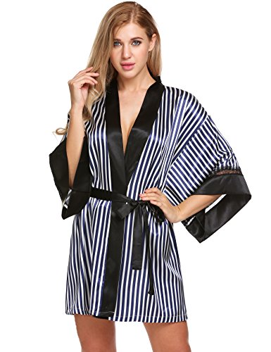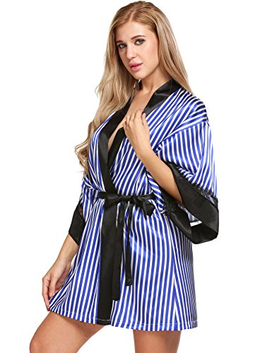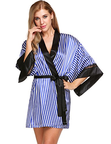Ekouaer Women's Lace Trim Short Kimono Robe Seafolly Stripe Printed Sleepwear Nightgown Blue Medium