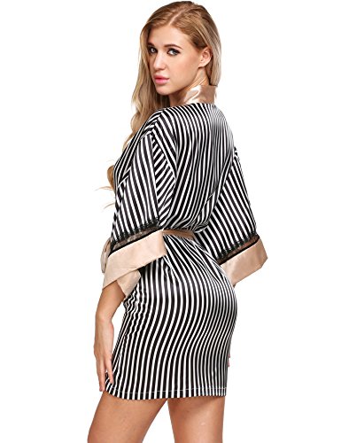 Ekouaer Women's Lace Trim Short Kimono Robe Seafolly Stripe Printed Sleepwear Nightgown Black X-Large