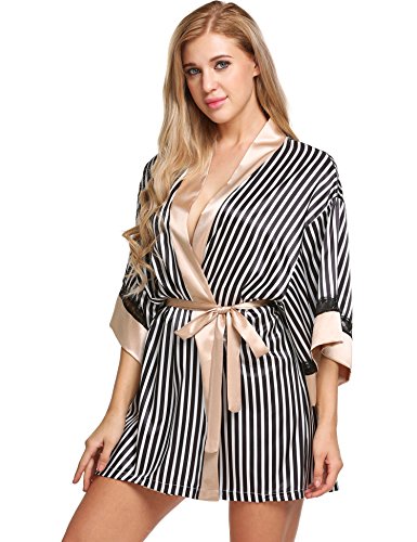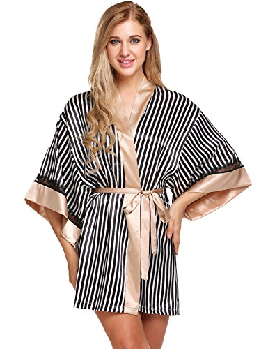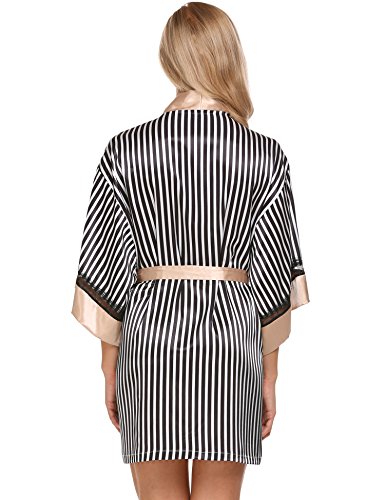 Ekouaer Women's Lace Trim Short Kimono Robe Seafolly Stripe Printed Sleepwear Nightgown Black Medium