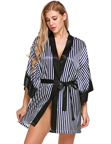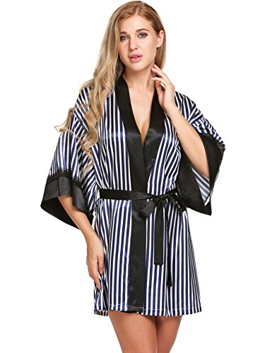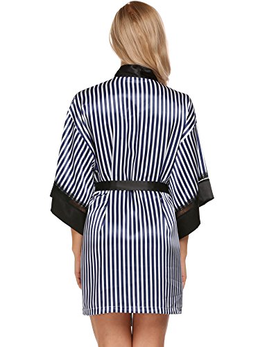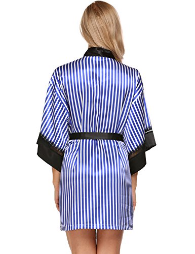 Ekouaer Women's Lace Trim Short Kimono Robe Seafolly Stripe Printed Sleepwear Nightgown Blue X-Large