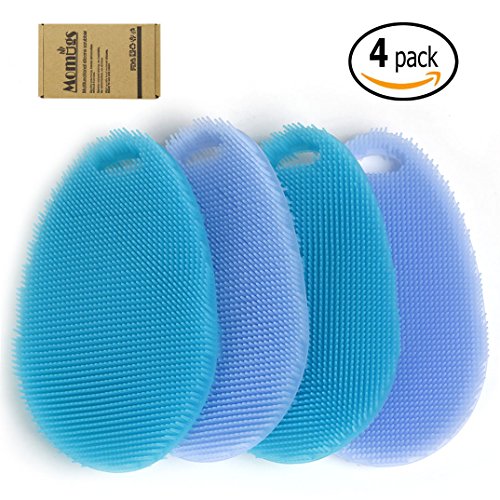 Silicone Dish Scrubber Kitchen Tool for Dishwashing with a box, Momugs Multi-purpose Antibacterial non scratch Cleaning Brush Cloths Towels, Set of 4, blue and Cyan