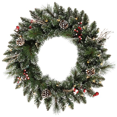 Vickerman Pre-Lit Snow-Tipped Pine/Berry Wreath with 35 Clear Mini Lights, 24-Inch, Frosted