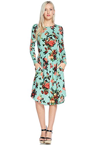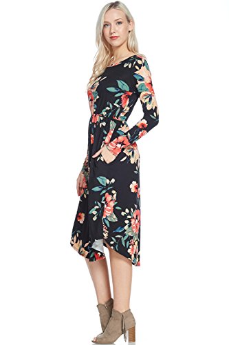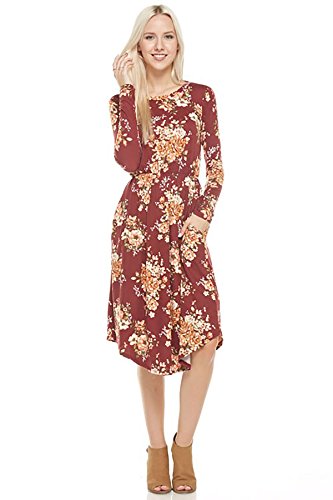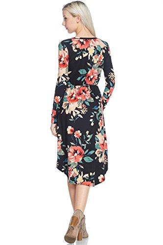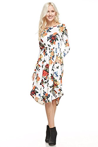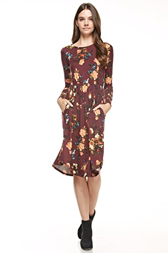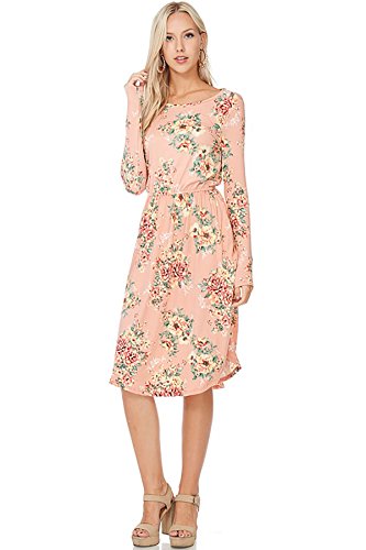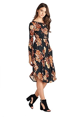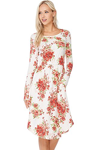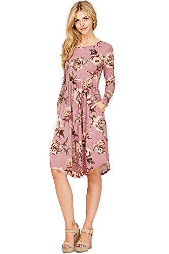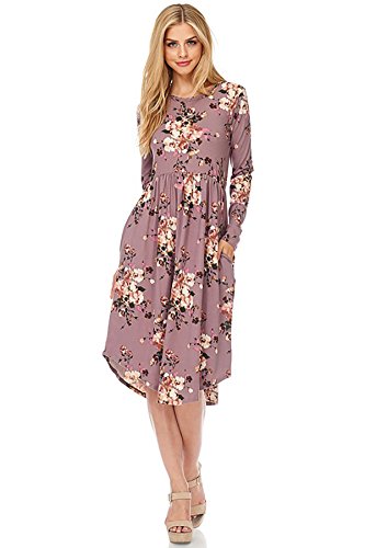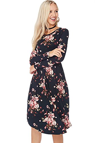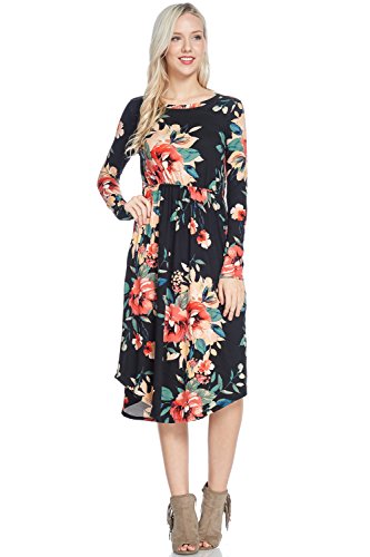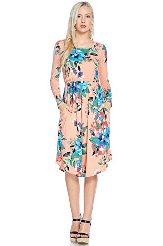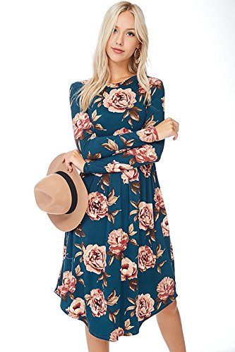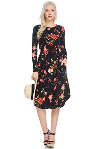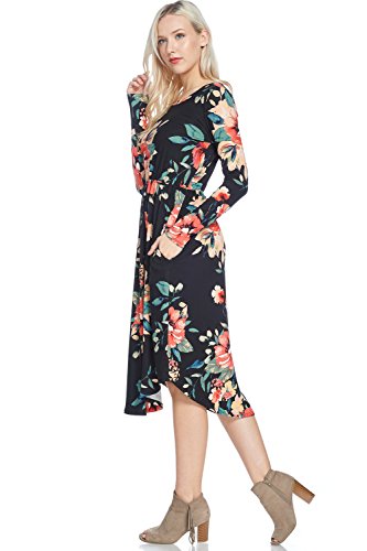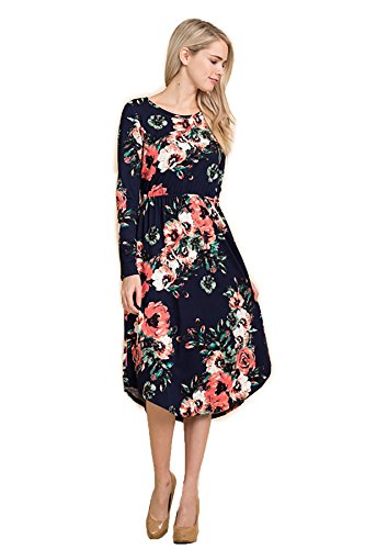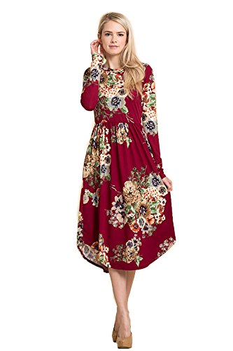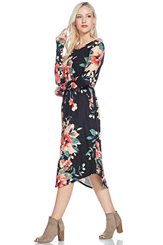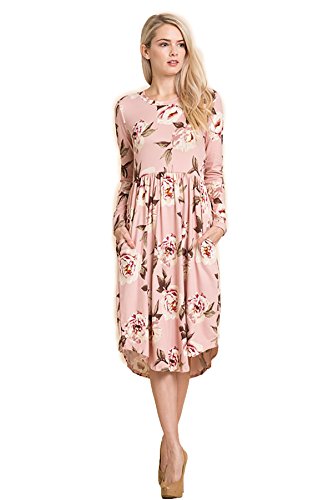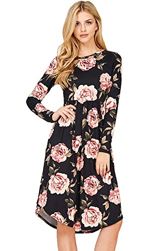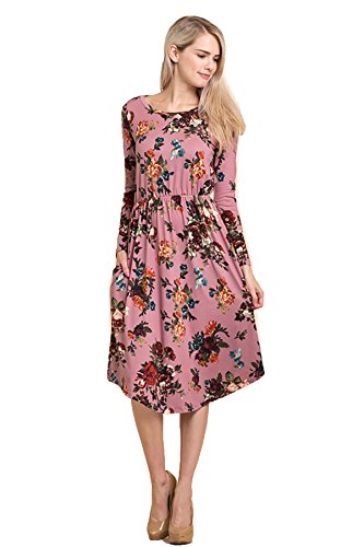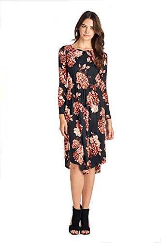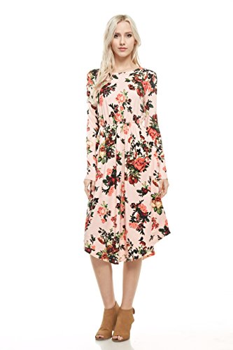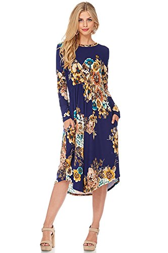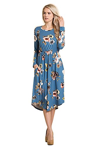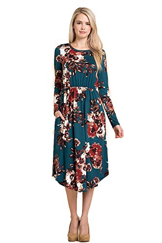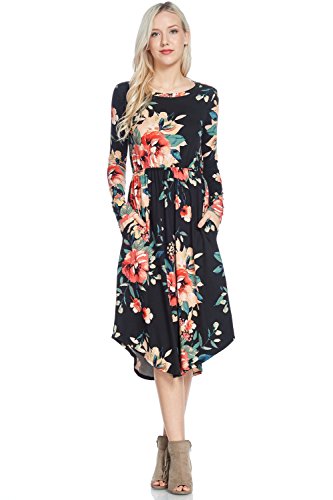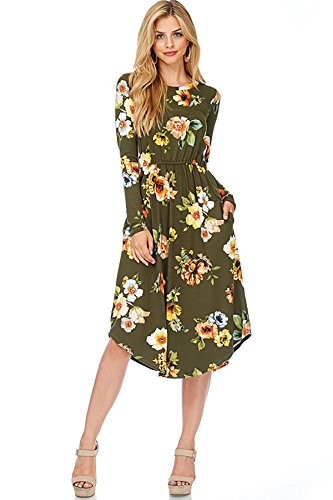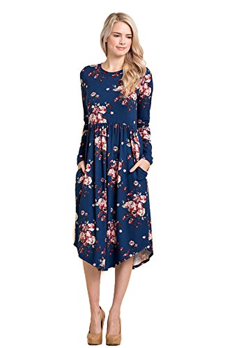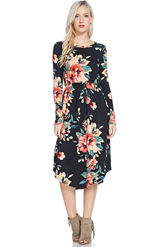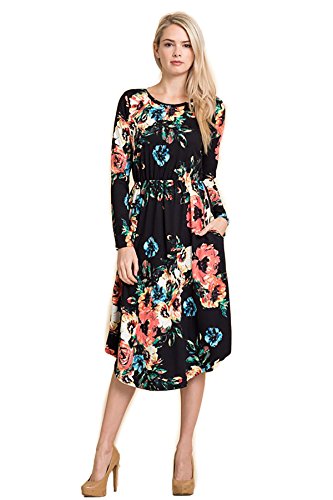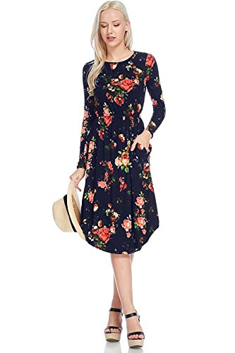 Long sleeve dress with round collar and pockets. Floral midi with ribbed gathering at the waist. Dress length is 41 inches and 37 inches on the sides. Models height is 5"9 wearing a size small. 95% Polyester, 5% Spandex. Made in U.S.A.Feature