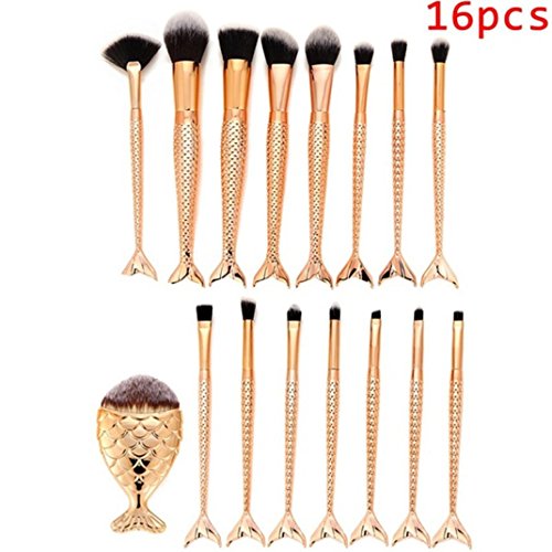 Professional Mermaid Makeup Brushes Kit 16 Pcs - Makeupstore Cosmetic Makeup Brushes Foundation Eyebrow Eyeliner Blush Cosmetic Concealer Brushes Beauty Tools Brush, Gold