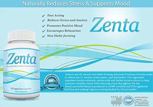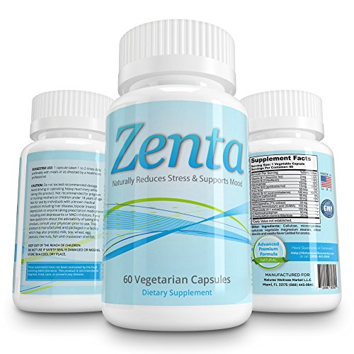 -. Binding : Health and Beauty -. Brand : Nature's Wellness Market -. EAN : 0712096606904 -. Feature : ANXIETY, PANIC, & STRESS RELIEF - Experience a rapid boost in relaxation and calm. Enhance your mood and better handle difficult situations. All while improving long term well-being and happiness. Designed for everyday use without causing fatigue. / SAFE, 100% NATURAL, NON-HABIT FORMING - Our premium quality ingredients make this an 100% natural anxiety relief supplement containing, easy to swallow veggie capsules, no artificial ingredients, no preservatives, no addictive ingredients, and no fillers. Unlike many prescribed mood support products, Zenta is drug free, 100% natural, and non-habit forming so you can have security in knowing what you're taking is right for you. This is as clean and pure as it gets. / CLINICALLY PROVEN - Our 13 powerful ingredients combine to form a premium formula of clinically proven ingredients in Zenta anxiety pills, designed to help calm and eliminate your body's natural response to stress, anxiety, depression and panic. What makes our formula unique is that each of the ingredients in Zenta work together to produce an effect greater than the sum of each individual ingredient. This new unique formula is found only in Zenta and proven to give you anxiety relief. / QUALITY - Zenta's ingredients are sourced from the highest quality suppliers and manufactured in the USA in our FDA approved facility while also abiding by strict cGMP certified standards to bring you the highest quality anxiety supplement. / HASSLE-FREE MONEY BACK GUARANTEE - We have great pride and confidence in our advanced premium formula that we have added our Guarantee to Amazon's Worry-Free Return Policy. If you don't feel more relaxed and anxiety-free after the first 30 days of use, we will issue you a full hassle-free refund and buy the product back from you less shipping and handling. -. IsAdultProduct : 0 -. Label : Nature's Wellness Market L.L.C -. Manufacturer : Nature's Wellness Market L.L.C -. ProductGroup : Health and Beauty -. ProductTypeName : HEALTH_PERSONAL_CARE -. Publisher : Nature's Wellness Market L.L.C -. Studio : Nature's Wellness Market L.L.C -. Title : Zenta Anxiety Relief - Natural Anxiety, Stress, & Panic Relief Supplement - 60 Veggie Capsules - Mood Enhancer Anti-anxiety Pills - Best Anxiety Supplements - Natural Stress Relief Supplement -. UPC : 712096606904