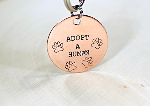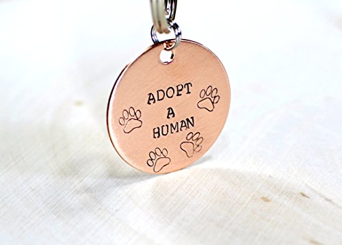 Product Description Handmade Adopt a human copper pet tag with cute paw prints . ! mm thick and about 1 inch in diameter . Secured with a small split ring and a larger split ring both made from stainless steel . The pet tag is customizable ( choose your options in the drop down ) 0