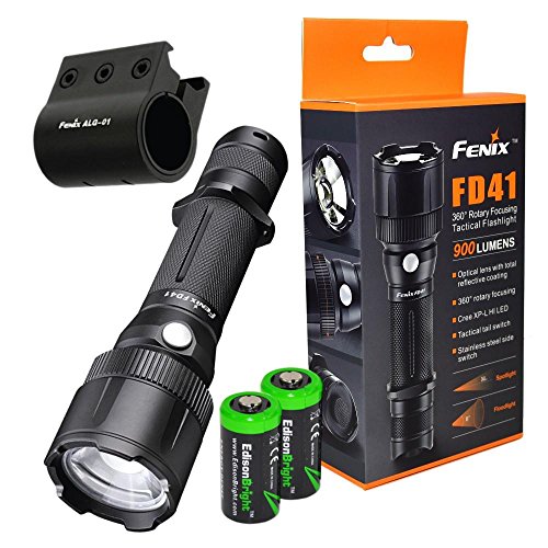 Fenix FD41 CREE LED 900 Lumen tactical Flashlight, Fenix ALG-01 Picatinny / Weaver weapon rail mount and Two EdisonBright CR123A Lithium Batteries bundle