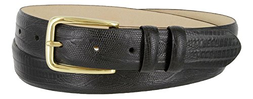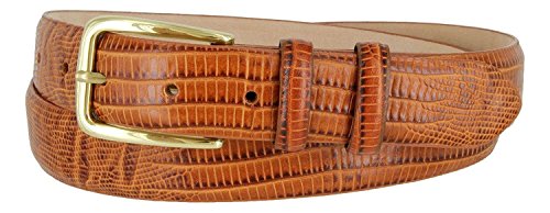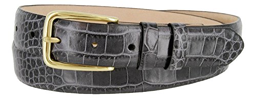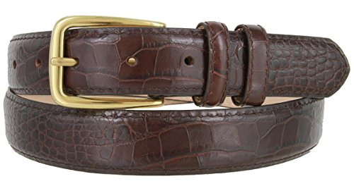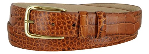 Binding : Apparel Product Description Classic Sleek Solid Brass Buckle with supple Genuine Italian Calfskin Leather belt. Double matching color and pattern leather keeper. 1-1/8" = 30mm wide and available in colors: Alligator Black, Alligator Brown, Alligator Tan, Alligator Grey, Alligator Navy, Lizard Black, Lizard Brown, Lizard Tan, Smooth Black, Smooth Brown, and Smooth White. Sizes available: 32"(81cm), 34"(86cm), 36"(91cm), 38"(96cm), 40"(101cm), 42"(106cm), 44"(111cm), 46"(117cm), 48"(122cm), 50"(127cm), 52"(132cm), 54"(137cm). Sizing: Measure around where you wear the belt, with your pants on, and order closest to that size. 0