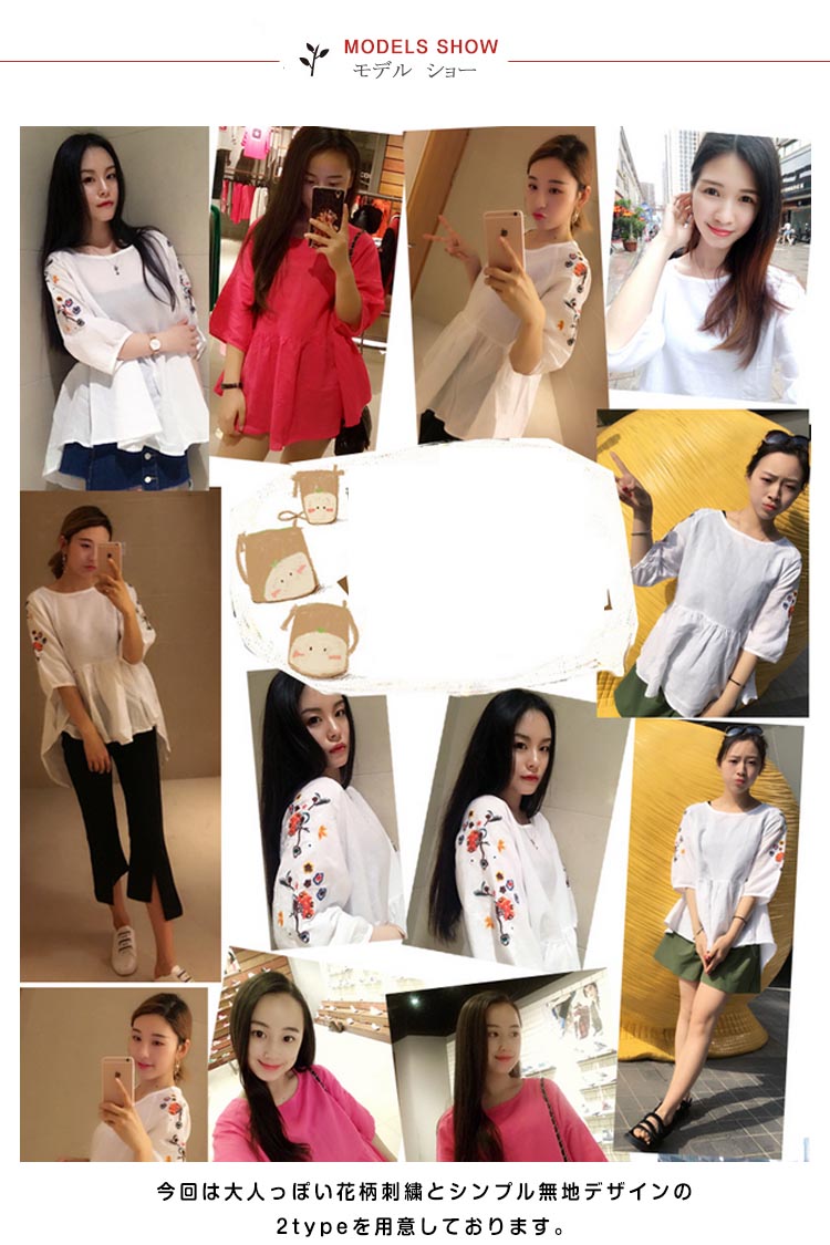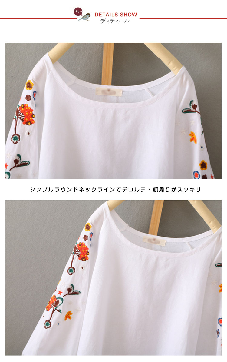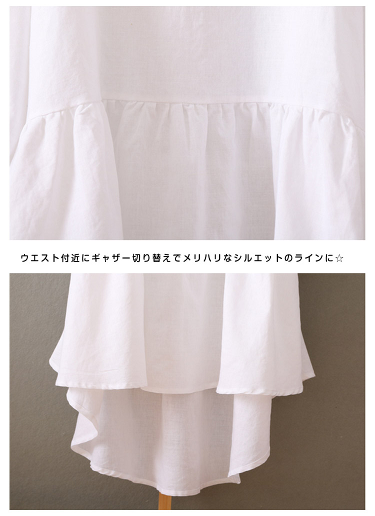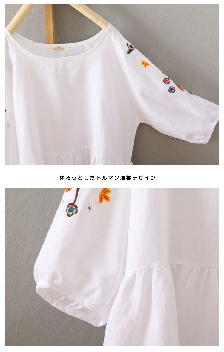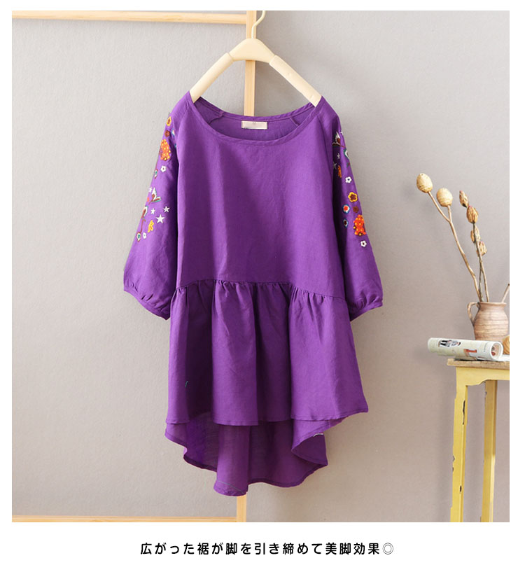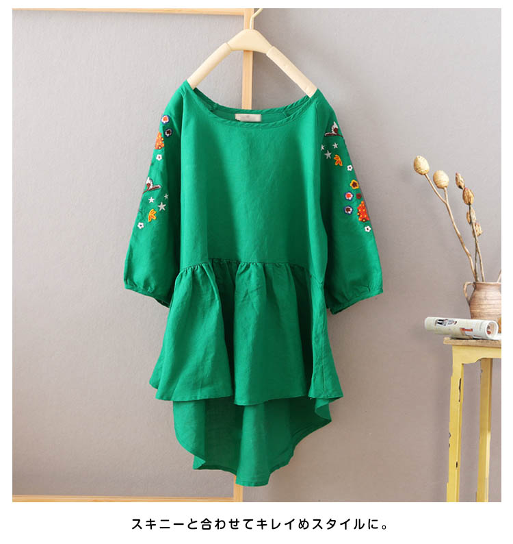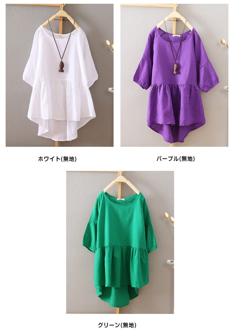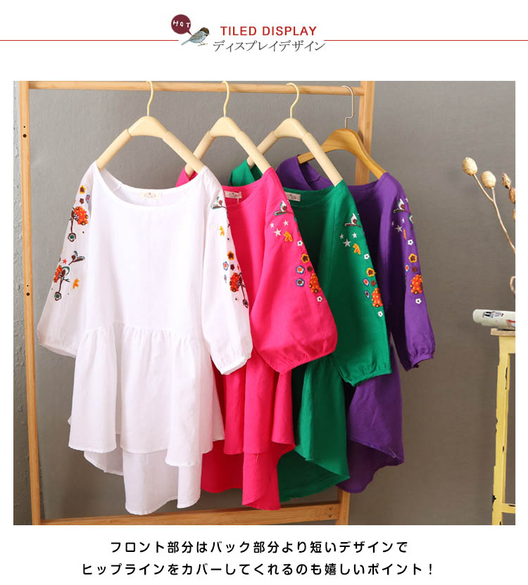 | さらりと風通しの良い綿・麻チュニック♪今回は大人っぽい花柄刺繍とシンプル無地デザインの2typeを用意しております。フロント部分はバック部分より短いデザインでヒップラインをカバーしてくれるのも嬉しいポイント!スキニーと合わせてキレイめスタイルに。広がった裾が脚を引き締めて美脚効果◎ | |