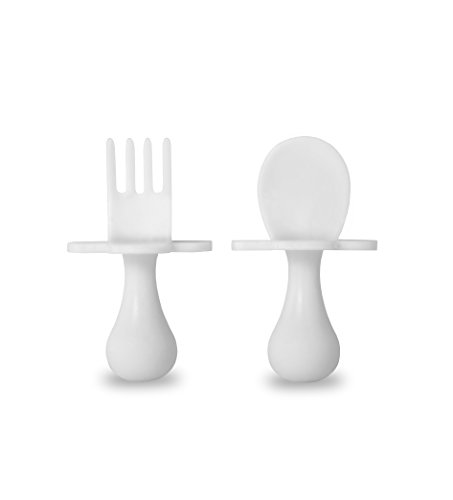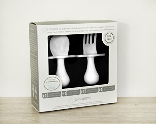 grabease First Self Feeding Utensil Set of Spoon and Fork for Toddlers (white). BPA free. To-go pouch
