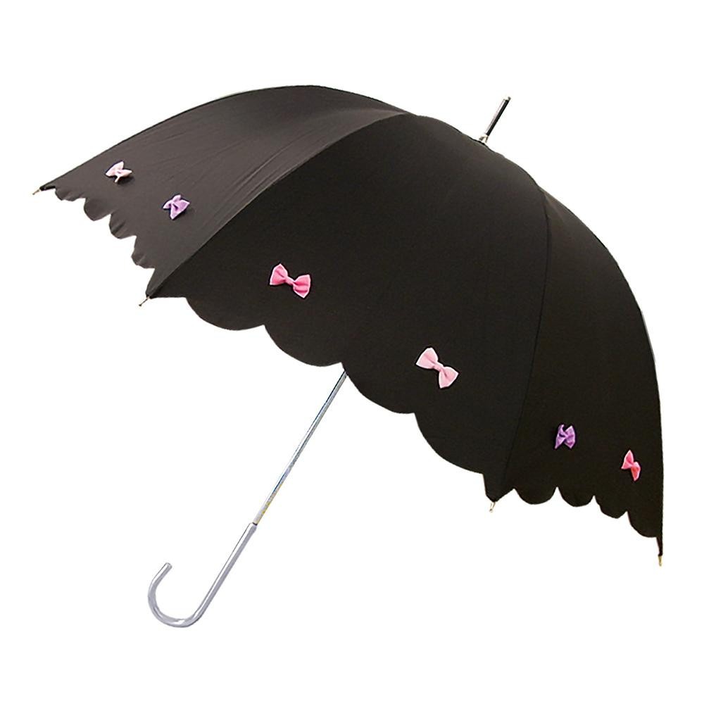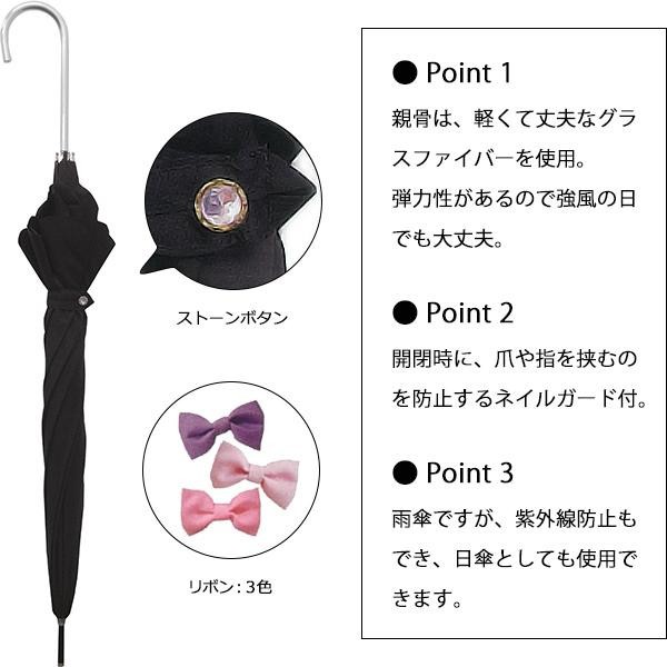 fk094igrjsリボンがあしらわれた、可愛らしいデザイン留め具のストーンボタンもポイントです サイズ (約)親骨:58cm、傘の直径:90cm 個装サイズ:7.0×71.0×7.0cm 重量 約255g 個装重量:350g 素材・材質 親骨:グラスファイバー(8本使用) 生地:ポリエステル 仕様 開閉:手開き 深張り 生産国 中国 スカラップデザインの、深張りタイプの長傘 リボンがあしらわれた、可愛らしいデザイン留め具のストーンボタンもポイントです