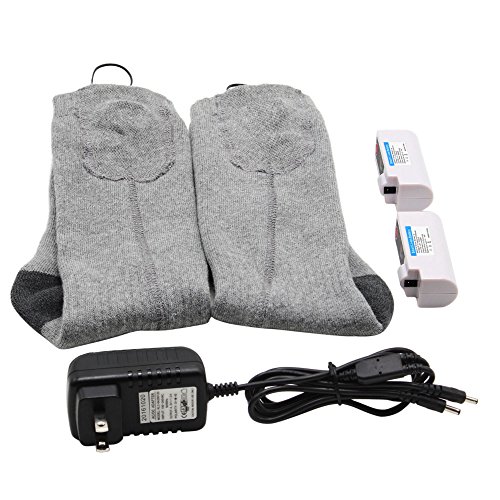 -. Feature : Rechargeable battery electric heated socks for chronically cold feet / Electric socks, absorbent, breathable, quick-drying, elastic thickened, electric modules using thin, soft / Padded reinforced heel & toe, and recessed heating element help focus heat in the toe to keep your feet from getting cold / Great for hunting, ice fishing, hiking, and sporting events. Won't shock, even when wet / Includes (1) pair of socks, (2) 3.7V li-ion batteries, (1) ac charger