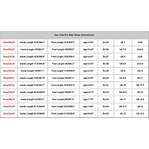 Binding : Apparel Product Description NOTE: Please compare the detail sizes with yours before you buy!!! Use similar clothing to compare with the size. Specifications: 100% Brand new and high quality Sole material:Rubber sole Material of shoes:Artificial leather Soft material makes baby feel very comfortable Prefect for Winter daily use and easy to take off or wear Anti-slip design keeps baby in safe Great gift to baby Gender:Girls Pattern Type:Fight color Package content:1 pair shoes Note: Due to lighting effects, monitor's brightness/contrast settings etc,there could be some slight differences in the color tone of the pictures and the actual item If you have problem of the item, please contact us we will do our best to resolve the problem for you We suggest you choose a larger size, if your actual feet length is longer than the?above?feet length ☆Size(CN):26==Inside Length:15.5CM/6.1"==Foot Length:14.5CM/5.7"==Age:3-3.5T==EU:25==UK:7==US:8 ☆Size(CN):27==Inside Length:16CM/6.3"==Foot Length:15CM/5.9"==Age:3.5-4T==EU:26==UK:7.5==US:8.5 ☆Size(CN):28==Inside Length:16.5CM/6.5"==Foot Length:15.5CM/6.1"==Age:4-4.5T==EU:27==UK:8==US:9 ☆Size(CN):29==Inside Length:17.5CM/6.9"==Foot Length:16CM/6.3"==Age:4.5-5T==EU:28==UK:8.5==US:9.5 ☆Size(CN):30==Inside Length:18CM/7.1"==Foot Length:17.5CM/6.9"==Age:5-5.5T==EU:29==UK:9==US:10 ☆Size(CN):31==Inside Length:18.8CM/7.4"==Foot Length:18CM/7.1"==Age:5.5-6T==EU:30==UK:9.5==UK:11 ☆Size(CN):32==Inside Length:19.5CM/7.7"==Foot Length:18.5CM/7.3"==Age:6-6.5T==EU:31==UK:10==UK:11.5 ☆Size(CN):33==Inside Length:20.3CM/8.0"==Foot Length:19CM/7.5"==Age:6.5-7T==EU:32==UK:10.5==UK:12 ☆Size(CN):34==Inside Length:21CM/8.3"==Foot Length:20CM/7.9"==Age:7-7.5T==EU:33==UK:11==UK:12.5 ☆Size(CN):35==Inside Length:21.7CM/8.6"==Foot Length:20.5CM/8.1"==Age:7.5-8T==EU:34==UK:11.5==UK:13 ☆Size(CN):36==Inside Length:22.3CM/8.8"==Foot 0