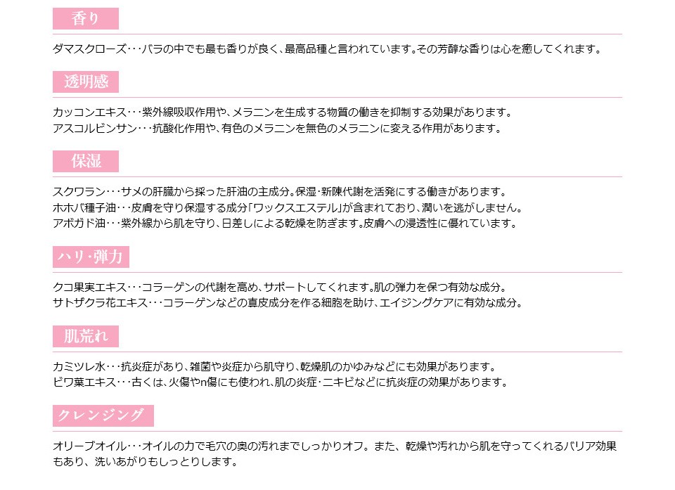 グリセリン、DPG、オリーブ油、(ベヘン酸/エイコサンニ酸)ポリグリセリル-10、(ベヘン酸/エイコサンニ酸)グリセリル、ステアリン酸グリセリル(SE)、PEG-10ヒマワリグリセリズ、ラウリン酸ポリグリセリル-10、ミツロウ、フェノキシエタノール、水、ハチミツ、BG、スクワラン、加水分 解ヒアルロン酸、3-0-エチルアスコルビン酸、ダマスクバラ花油、ホホバ種子油、ヒマワリ種子油、ローズマリー油、アルガニアスピノサ核油、ワサビノキ種子油、アボカド油、プラセンタエキス(ウマ)、カミツレ水、ダマスクバラ花水、1,2-ヘキサンジオール、ローズマリー葉エキス、ユズ果実エキス、ビワ葉エキス、乳酸桿菌/セイヨウナシ果汁発酵液、乳酸桿菌/ブドウ果汁発酵液、サトザクラ花エキス、クコ果実エキス、アロエベラ葉エキス、クロレラエキス、水溶性コラーゲン、クズ根エキス、アスコルビン酸、リンゴ酸、トコフェロール、シアノコバラミン、香料 |