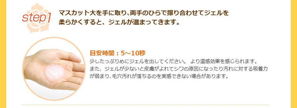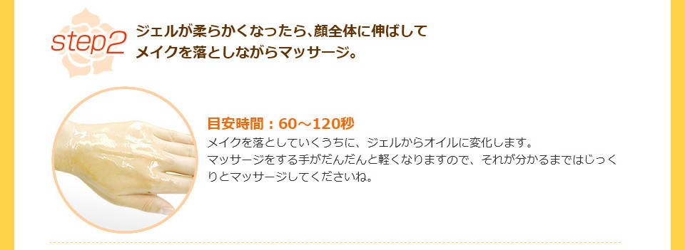 適量を乾いた手のひらに取り、両手のひらを軽くすり合わせてゲルをやわらかくします。顔全体にゲルをのばして、30秒~1分程度やさしくなじませます。メイクがなじんだら、水やぬるま湯で丁寧に洗い流してください。