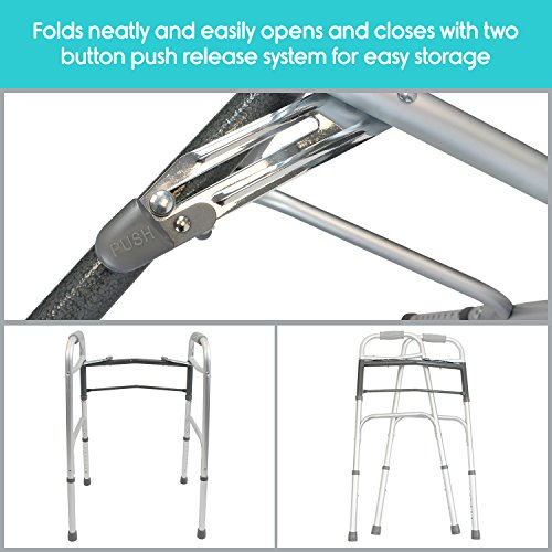 PUSH BUTTON FOLDABLE DESIGN: Two-button release mechanism allows the portable walker to be quickly folded down for convenient travel or storage. The push button release can be operated with the palm or side of the hand for those with limited dexterity.