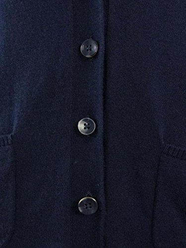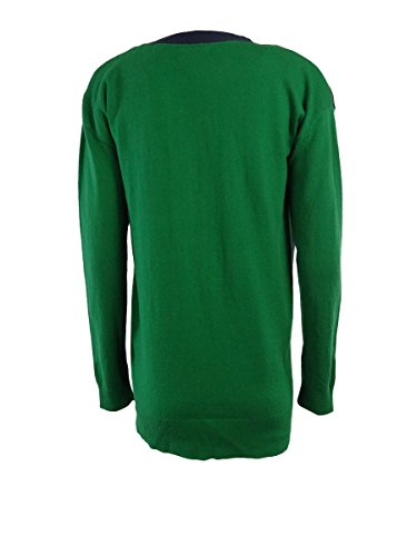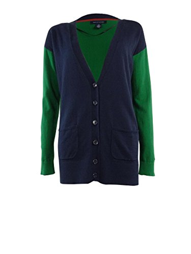 This feminine knit sweater from Tommy Hilfiger features ribbing at waist and cuff, long sleeves, v-neck, two pockets, five button front, and knit finish.