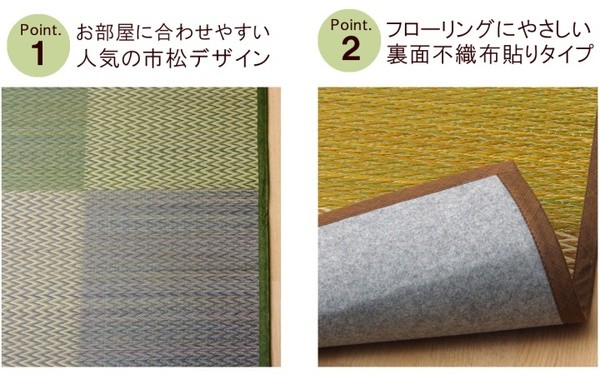 市松柄でシンプルなデザインに仕上げたイ草カーペットです。い草には空気の自然浄化作用、湿度の調節作用などがあり、汚れにくいという特長があります。フローリングを傷つけにくいよう、裏には不織布を貼っています。い草に青森ヒバ加工を施しています(抗菌・防臭効果)。青森県のヒバの木から抽出した「ヒバ油」をメーカー独自の技術で材料や商品に加工しました。「ヒバ油」には、ヒノキチオールという天然物質としては極めて抗菌性の高い成分が含まれ、医療や食品など多分野で利用研究が進められています。※自然素材であること、また職人が一つ一つ手作業にて加工を行うため、形状のバラつきや表示サイズと多少異なることがあります。ご了承下さい。