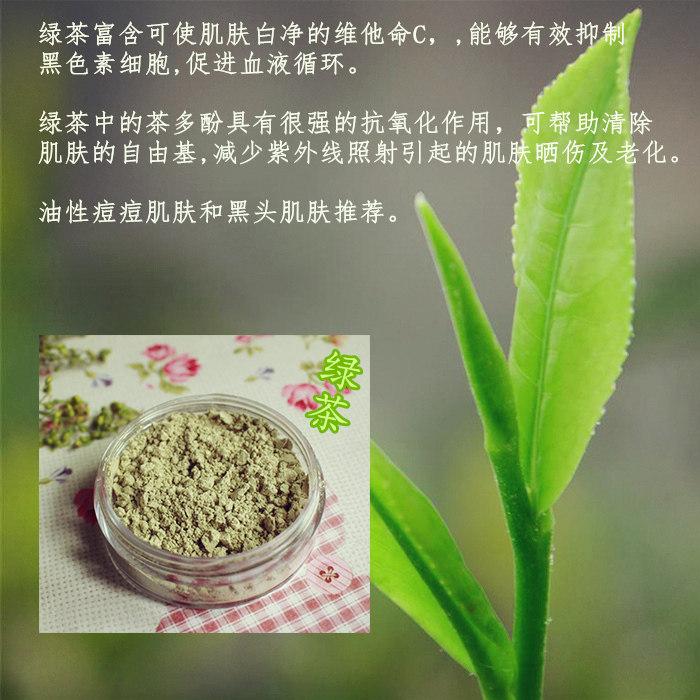 天然植物绿茶粉:绿茶味道清新,具有良好的抗氧化和镇静作用。可使皮肤更加细嫩、光滑。适合出油 痘痘 粉刺 黑头的皮肤,同时如果您长期面对电脑,绿茶可以很很好的防辐射,保护您的肌肤健康。所以久坐电脑的MM推荐这一款哦!
